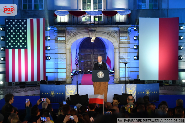 Przemówienie prezydenta Stanów Zjednoczonych Joe Bidena na Zamku Królewskim w Warszawie, skłania do kilku refleksji i wniosków. Zacznijmy od kwestii niewątpliwie na plus. Już sam fakt wygłoszenia takiego przemówienia w momencie inwazji Federacji Rosyjskiej na Ukrainę w dniu w którym zaatakowany został Lwów, w stolicy państwa które stało się państwem frontowym, można interpretować jednoznacznie – pozytywnie. Ponadto, prezydent USA w trakcie swojej wizyty w Europie, odwiedza Brukselę i uczestniczy w nadzwyczajnym szczycie NATO i UE. Jedyna stolica która odwiedza po wizycie w Brukseli to Warszawa. Niewątpliwie, wpływa to znaczącą na podniesienie wiarygodności, prestiżu i generalnie pozycji Polski na arenie międzynarodowej, pokazując istotną rolę naszego kraju w kontekście wydarzeń na Ukrainie. Polska staje się liderem wśród państw położonych na wschodniej flance NATO i zdecydowanie, Polski głos i aktywność na arenie międzynarodowej, bez względu na to czy trafna czy obarczona większym błędem bądź ryzykiem (patrz. kwestia dostarczenia Migów-29 dla Ukrainy) staje się najbardziej wyraźnym, słyszalnym głosem. Obecność prezydenta USA w dniach 25-26.03.2022 w Rzeszowie i Warszawie, niewątpliwie wzmacnia poziom sygnalizacji strategicznej płynący z Warszawy. Samo wystąpienie na Zamku Królewskim wygłoszone wieczorem 26.03.2022, które miało być i było, punktem kulminacyjnym wizyty, zmusza do komentarza i wniosków.